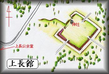 県道25号線の「上長」のバス停の北300mほどの所にある。上長地区の公会堂の前の道は北側にカーブしているが、その途中の東側の山林の中に館の跡がある。館のある部分の北側には小川が流れており、この沼沢地に臨む微高地上を占地している。