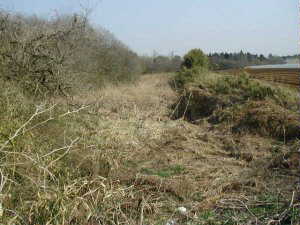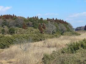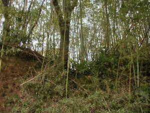 ここも笹藪がひどくてよく分からない。かつてこの土塁の上は、松並木が植えられていたらしい。そのころは風光明媚な景色であったのであろうが、現在は松食い虫にやられてしまって、かわりにこの笹藪になってしまったものだということだ。