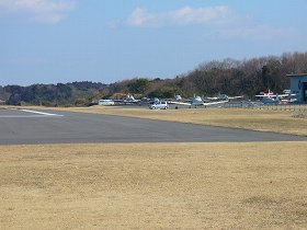 | 島津城方面への入口の反対側には阿見飛行場がある。遊覧飛行ができるらしいので、一度は乗ってみたいものだ。見学も自由である。 | 飛行場から反対方向(西側)に200mほど行った所が城の入口である。こうして通がカーブする場所の左側である。主郭部はこの正面奥となっている。 |