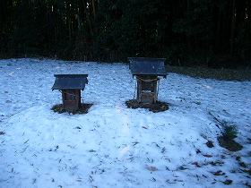 | Cの虎口。切り通しの虎口を連続して2ヶ所通って上がっていくと、横堀Bに出るようになっている。 | 主郭にある祠。これが稲荷神社なのであろう。畑の中にあるというのも不思議だ。 |
