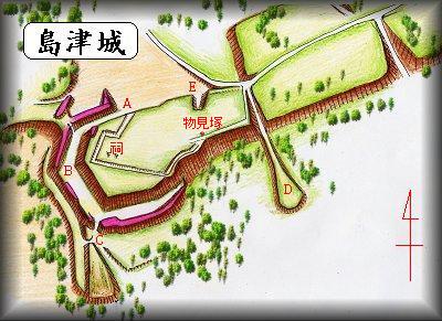 島津城は阿見飛行場のすぐ西側にある。したがって城址に行くには阿見飛行場を目指していくのがよい。阿見飛行場入口の反対側に、西側に入っていく道がある(道路脇の土手に小さな祠がいくつか建っている)。この道を300mほど進んでいくと、道は下り坂になっていく。道が下りながら右手に大きくカーブする辺りから左手の畑に入っていく道がある。この道はかつては堀切であったかと思われ、これを南側に進んでいくと、道は切り通しになり、やがてDの土手状の高まりの所に到達する。