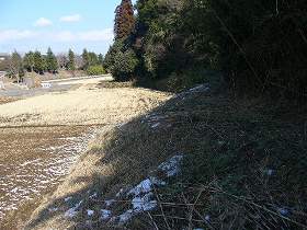 | 御城西側下の横堀。この城の最大の見所である。深さ5m、幅8mほどもある。木原城を除けば、これだけ大きな横堀は、稲敷地域だ最大級である。 | 横堀の外側の土塁部分。高さは3mほどある。 |