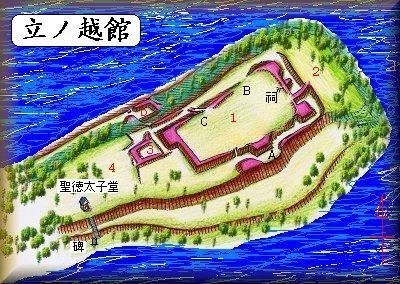 横矢張り出しなどの構造が技巧的なわりには、1郭内部に進入するための虎口がはっきりしない。おそらく、Aの西側の辺りと、Cの2ヶ所が虎口であったのだと思われるが、あまりぱっとしない虎口である。ただし、Cの下の横堀をさらに下に降りていくとDの枡形構造の所に出る。後世になってDの部分にこのような空間をつける必要があったとも思われず、これは城の枡形であったとみてよい。つまり北側下からの登城道が設定されていたということになる。かつて周囲はみな沼沢地であったであろうから、この下には船着場のようなものがあったと想像できる。