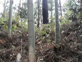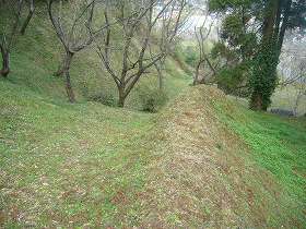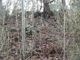 | 3の郭の東側下の三日月堀の外側にある土塁。弧を描いている。ここの堀はいかにも城らしいものである。 | 1の郭の城塁を東側下から見たところ。一応切岸らしく見える。 |