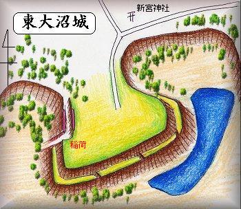 東大沼城は、伊藤鉄工所の北側に突き出した比高20mほどの台地上にあった。県道125号線のESSOのガソリンスタンドの所から「あづま健康センター」の前を通って台地を上がっていく。上がりきった辺りから西側の道に入って300mほど行くと新宮神社があるが、その西南の台地が城址となる。城址は畑地や作業所となり、入口の両脇には赤い門柱がある。