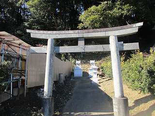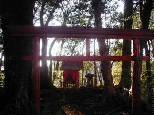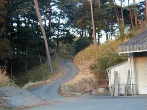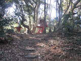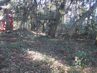 台地西側には土塁の跡らしきものがわずかに残り、その上に、下の写真の小さな神社がある。この脇が虎口のようになり、下に続く道がある。この道のところが2段の腰曲輪のようにも見える。