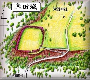 県道5号線と国道125号線とが交わる幸田の交差点の北西部にそびえる比高20mほどの台地上が城址であったらしい。どの辺りが中心部なのか分かりにくいが、台地中央部の熊野神社の南側の奥に入っていった所のお宅の脇に写真の土塁の残欠のようなものが見られた。