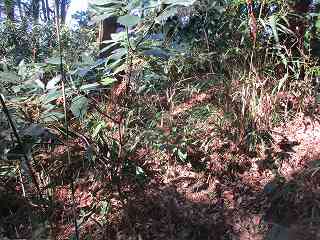 このお宅は周囲より1,5mほど高い壇の上にある。南側は断崖絶壁である。探せば他にも土塁や空堀などありそうだが、どうみても個人のお宅の敷地内なのでやめておいた。この辺りが台地の南端部で、南側の土手は竹林になっているが、上から見ると垂直に近い急斜面で、要害の地形であったことが分かる。
