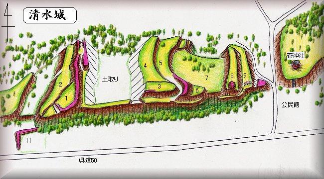 清水城は、県道50号線沿いにある菅神社の西側一帯の台地上に展開していた。この台地は東西に細長く延びているもので、両端を削ってしまえば容易に独立台地状にすることができる地形である。県道側から見ると、この台地が広大な稲敷台地の南端部であるかのように見えるのだが、実際には、この台地の北側にも広い谷津が入り込んでいるのであり、背後に天然の谷津堀を持っているかのような地形である。