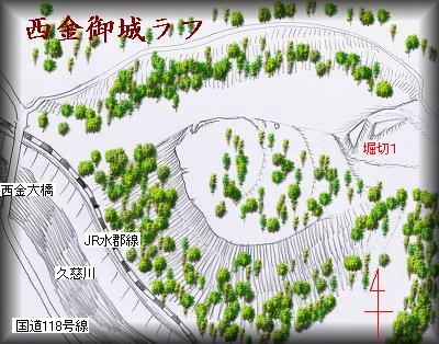 | (以前の記述)西金御城は大子町南部の西金(さいかね)地区にある。室町期の城館で、山林、宅地になっているという。 | |