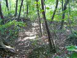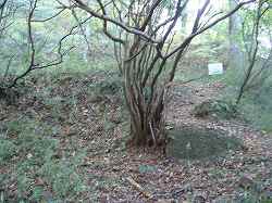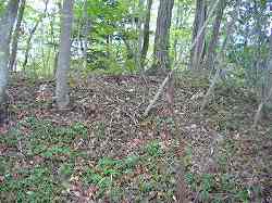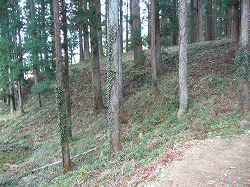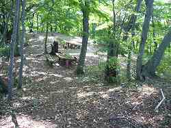 | Aの部分にある堀切状の部分。といっても深さは50cmほどしかなく、これでは堀切とはいえない。浅すぎて写真にするとさっぱり分からない。 | AとBとの間の山頂部分。家一軒建てるほどの広さもなく、ここも郭とは呼べないであろう。 |