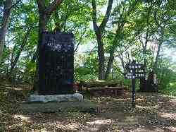 | 山頂にはこのような立派な城址碑が建っている。この記念碑は野内(やない)一族、月居一族の浄財によって、昭和57年に建立されたものだというが、こんな大きな石碑をどうやって下から運んだのだろうか。 | 城の北側の一番高い部分から、下の2段構造の郭を見たところ。城の中心部分はこれだけである。掘っ立て小屋一軒立ててハイオシマイ、っていう程度のスペースしかない。 |