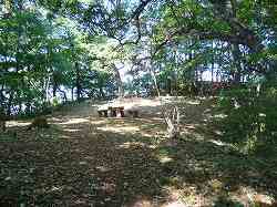 | 4の郭にある東屋。長軸20mほどの郭で、西側には腰曲輪を配置している。 | 1郭との間にある堀切。堀底部分を盛り上げて遊歩道を造っているようである。このようにこの城は、遊歩道を付けることによって、城の地形をあちこち改変してしまっている。 |