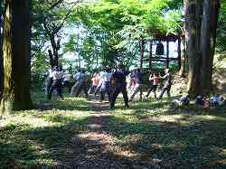 | Aの寺院跡では、太極拳をする人々がいた。こんな山中で無言で身体を動かしているさまはなんとも言えない雰囲気である。ちなみにこの人たちは下からここに上がり、太極拳をした後、そのまま下山していった。 | 月居観音堂の真上にある水戸烈公の碑。天保5年(1834)、この地を訪れた水戸斉昭は、ここで次のような歌を詠んだという。 「尋ぬれば人は昔の名のみにて、雲井の月ぞ澄みわたりける」 石碑は岩盤の上にあるので、この上も極めて眺望がいい。しかし滑り落ちたらアウトなので気をつけよう。 |