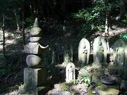 | 山王山山頂の1つ下のスペース。石段には段数がついていて、袋田の滝から上がってくると、山王山頂上で1214段ということである。金毘羅様よりも段数が多いとは・・・・・・。袋田の滝から上がってきた方、ご苦労さんです。 | Aのスペースの角にはこんなものがたくさんある。やはり寺院だったことは間違いない。 |