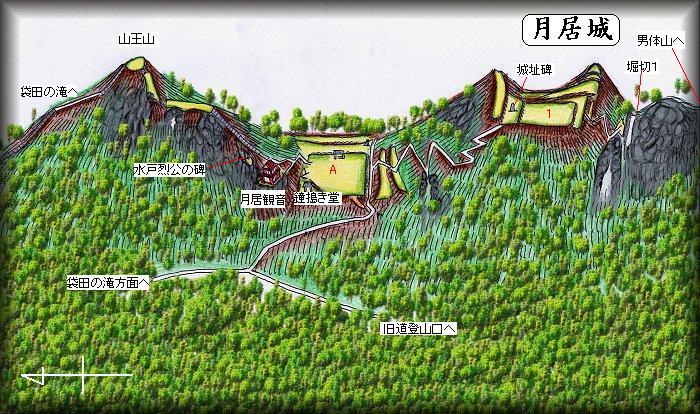 (以前の記述)大子町には有名な袋田の滝がある。名物の刺身こんにゃくを食べ、入場料を払ってトンネルをくぐっていくと、目の前に見事な滝が現れる。これが袋田の滝だ。滝は袋田滝と生瀬滝の2つに分かれている。この滝の背後、南側にそびえ立っている標高404mの月居(つきおれ)山、それが月居城の跡である。城は山城で、険しい道を上がっていくと、月居観音が祭られている。 |