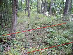 背後の山稜に登ってみると、Aの部分に、若干掘り下げた地形が見られた。しかし、深さ50cm、幅1mくらいの規模である。これではとても堀切とはいえないであろう。何のために掘ったものなのかは不明であるが、城郭遺構ではないと思う。