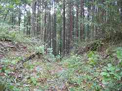 | 久慈川越しに国道118号から見た西金御城。比高50mほどの山上にある。一見、たいしたことのない山に見えるのだが(それがフェイントでもあったのだが)、笹薮だらけの山をあなどってはいけない。 | 堀切1。深さ5m、幅8mほどの本格的な堀切である。この辺りまではぜんぜん、危なくなかったのになあ。 |