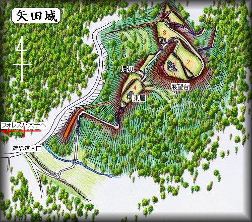 | (以前の記述)矢田城の位置はよく分からないが、大子広域公園の辺りであろうと思われる。付近には和田城がある。詳細は不明だが、室町期の城館で、現在は山林となっているという。 | |