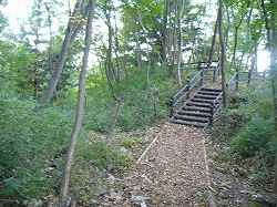 | 烈公の碑から山王山に向かう石段。かなり急な石段となっている。 | 山王山にある岩盤の1つ。割れていて押したら完全に分断できそうである。 |