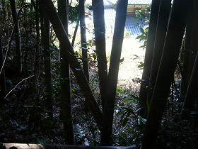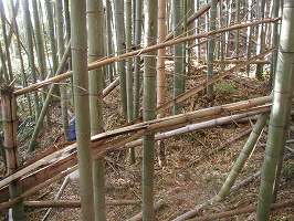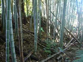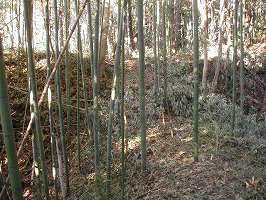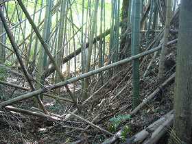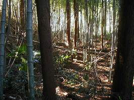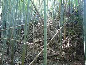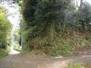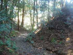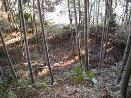 | Eの虎口から、下の腰曲輪を見たところ。その下は民家である。 | 1郭と2郭との間の通路。堀切にしては浅く、自動車道を通す際に切られたものである可能性もある。 |