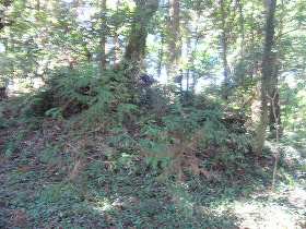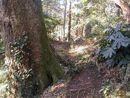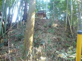 | Dの下の切り通し道。近代の所産かとも思われるが、かなり立派な虎口に見える。 | Dの腰曲輪からAの櫓台を見たところ。櫓台の上には小さな神社が祭られている。 |