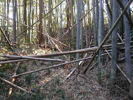 | Cの下辺りの横堀。堀の外側にも土塁を置き、比高二重土塁にしているのが特徴的である。深さ5mほど。 | 北側の横堀。北側に延びた部分との間を掘り切っている。やはり深さ5mほどで、堀の外側にも土塁を配置している。 |