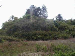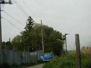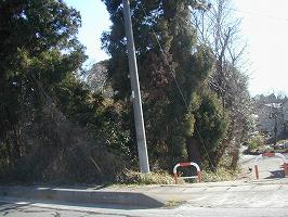 姥神狼煙台は、国道125号線と県道49号線とが合流する姥神の信号の南南東400mほどの所にある。県道49号線のすぐ西側に並行して走っている道があるが、その脇である。この先は何かの作業所になっているようで、内部に入れなさそうであったが、古墳のような土手があるのが見える。