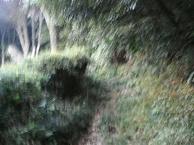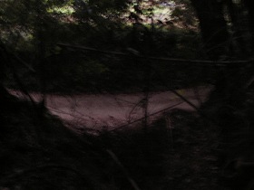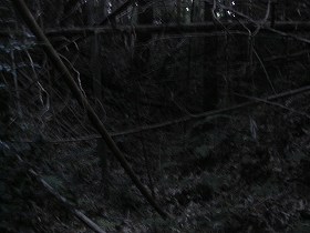 | 台地を分断する堀。台地基部側の深さは4m、先端側は2mほどである。もう山の中は真っ暗だ。 | 東側は竪堀となって台地下の道と接続している。 |