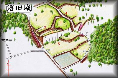下の以前の記述にも書いてある通り、沼田の常晃寺の東側の、比高15mほどの台地上に遺構がある。地元では「二重堀」と呼ばれており、城というよりも、堀として認識されている。簡単に言うと、台地上に上がる東西の道は切り通し状になり、それを繋ぐようにして台地を東西に掘り切るような堀が台地上に展開しているという形態。二重堀といわれる所以である。