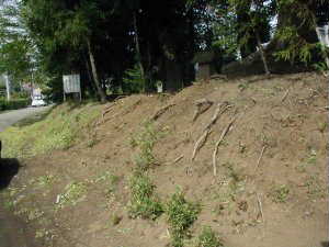 この写真は、県道49号線脇の、佐倉神社(県道の西側の小さい方)の裏にある土塁。神社遺構かとも思われるが、しかし、この立派さは、やはり城館のものであると見ておきたい。残存状況は一部だけで、堀もないが、ここが1つの郭であったのであろう。