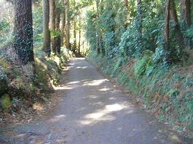 | 南西から見た沼田城。この台地の上に堀がある。 | 常晃寺の東側の民家の脇から台地上に上がる道。切り通し状になっている。暗くなってきたので、カメラがぶれること! |
