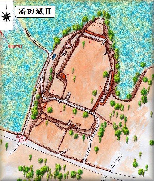しかし、高田神社とは異なり、こちらには明確な城郭遺構が存在している。しかも、それは単なる出城といったレベルのものではなく、規模・城域ともにかなりしっかりとした城である。そういうわけで、ここにある城には高田城とは別の名称を付けるのがふさわしいと思うのだが、適当な名称が思いつかなかった。仕方がないので、仮にこちらを高田城Uとしておく。