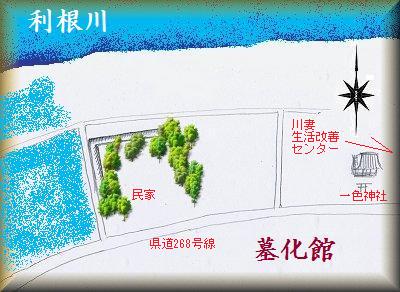 「茨城県遺跡地図」によると、川妻の一色神社と稲荷神社のちょうど中間の辺りに墓化館があったという。ここは一軒の民家のお宅の敷地となっているが、裏の竹やぶの中に、写真のような堀の跡が残存している。深さは現状では1.5mほどであるが、幅は4mほどある。また周囲の水田は一段低くなっており、水堀の跡であるかも知れない。館の南側にはかつては「前沼」と呼ばれる沼があったという。館自体は藤沼家という中世以降の庄屋の屋敷であるという。これがどの時代までさかのぼれるものなのかよく分からないが、中世段階でも居館であった可能性は高い。規模は方100mほどである。