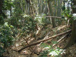 城郭遺構が明確に見られるのは寺院の背後(北側)である。ここには高さ3mほどの土塁と、その外側に空堀を配した遺構がかなりの部分、残存している。堀底は現在でもややじめじめしていることから、水堀であったと思われる。この堀と土塁は東側の角でクランクして南側に延びているが、その途中で分断されている。ちょうど分断されている部分の土塁の写真を下に挙げてあるので見ていただきたい。郭内からの高さが2m程度の土塁である。土塁の切れは北側に1箇所あるが、これが本来のものであるのかどうか分からない。というか多分違うであろう。外側には土橋などがないのである。これはおそらく後で寺院に出入りするために空けられたものではないかというように思われる。この城は一時的とはいえ北条氏が取り立てた陣城であるのだから、虎口にはもう少し工夫があってしかるべきと思うのである。
