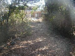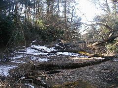 | 松本家の北側の土橋。 | 松本家の北西側にある巨大な堀跡。城塁は何度も横矢折れのクランクを持っている。図の土塁が突き出した部分の北側である。 |
