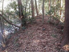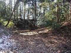 | これがその反対側(土塁が突き出している部分の南側)堀幅は15.6mほどある。 | 東側に向かって突き出した土塁。ここから両脇下の敵を攻撃するようにしていたのであろうか。この背後の郭に祠がいくつか祭られている。 |