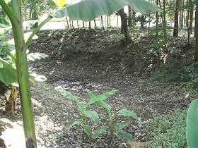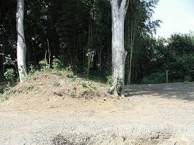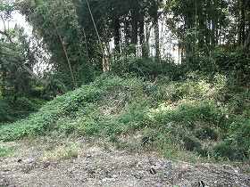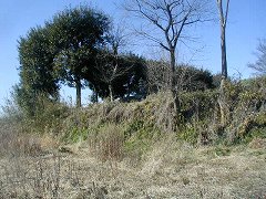 | 北東側の土塁を外側から見たところ。この辺り、堀は埋められている。 | 東側の土塁の切断部分。堀もこの手前で埋められてしまっている。 |