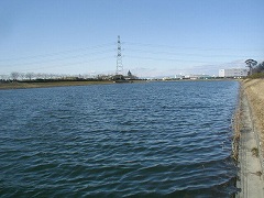 | 権現堂川に臨む本丸跡の名残かと思われる城塁。 | これが現在の権現堂川。きれいな川である。本丸周辺は河川改修で消滅していたと思っていたが、こうして見てみると、けっこう地形は元のままのように思われる。 |