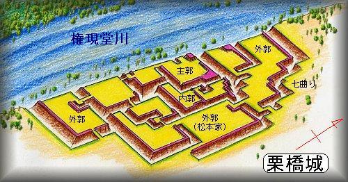 栗橋城の鳥瞰図であるが、実際のところ、古河城と同様、権現堂川の改修によって城地のほとんどが削り取られてしまっているために、現在見ることができるのは、図の「松本家」とある部分と、七曲りの一部だけである。しかし、江戸時代の「城築規範」という古図集には、この城の絵図が収録されており、その図が現在見られる東側の一部の遺構とほぼ一致することから「城郭体系」などでは、これに基づいた縄張り図が掲載されている。この図もそれを参照したものである。