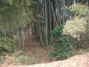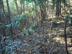 内部は竹ヤブとなっているのだが、その中に三方向に土を削った跡が見られる。規模こそは「堀状」であるが、重機で削ったような感じのもので、後世の作為であると思われる。