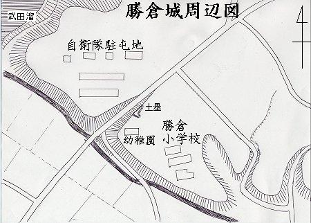 ただし、小学校建設で整地した際に埋め残された沢の一部分であるに過ぎないかもしれない。また、勝倉幼稚園の脇には土塁が、小学校のプールの奥には物見台と呼ばれる古墳状の高まりがある。