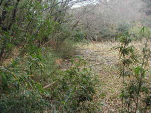 雄害城はさわの台団地西側の台地先端部にある。雄害はもちろん要害がなまったものである。西側の台地基部からアクセスすると、藪をかなり通らねばならないようであったため、以前は、東の下側から上がろうとしたのだが、幅の広い水路に阻まれてしまい台地を登る事ができなかった。そこで、今回は西側の道路の切り通し部分から藪を抜けて先端まで行く事にする。しかし遺構のある先端までは藪を300mほど踏破しなければならないので大変だ!
