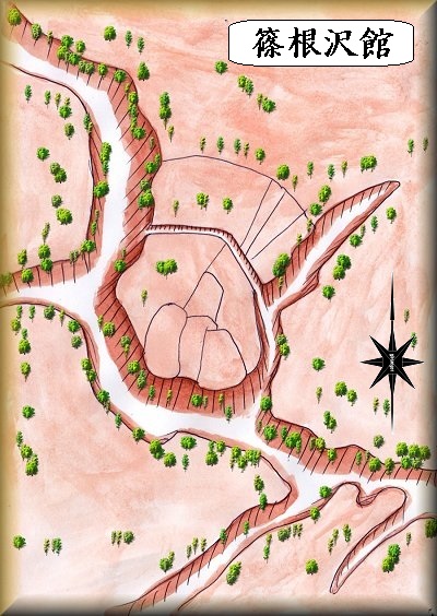 このバス停の200m南から東側に入っていける道があるのだが、そこを400mほど走ると川を渡り、左手に上がっていける道が見える。これが篠根沢館跡である。
