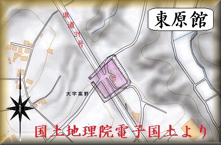 東原館は、県道31号線と284号線とが交わる交差点の北西600mの所にあり、県道31号線が城址を真っ二つに切断してしまっている。
