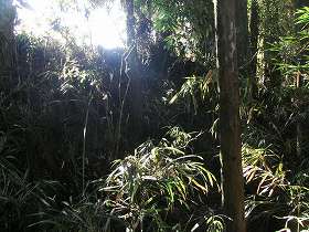 | 北側の先端部から見た小山城。城の本体は先端部分ではなく、中ほどまで進んだところにある。 | 台地基部を切り離す堀と土塁。深さ2mほどと小規模である。この城はヤブがとにかくひどくて、まともに写真を撮れる遺構がほとんどない。 |