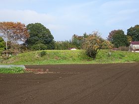 | 北側の側面部。高さは8mほどだが、切岸状の土手となっている。 | 館内部。宅地や果樹園、墓地などになっているようだ。 |