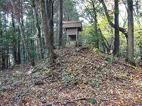 | 山頂に祭られている神社。塚状の高まりの上に鎮座している。 | その西側には平坦な地が続き、側面部は切岸状の土手となっている。 |
