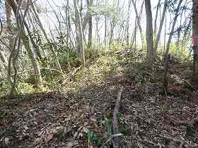 尾根を進むとすぐにテラス状の小郭が見えてくる。造作は甘く、あまりきちんと造られている感じではない。これを越えていくと1郭下の腰曲輪に出る。その上の1が主郭であるが、城塁の高さは1mほどでしかない。