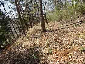 しかし、Bのピークはまったくの自然地形のままであった。ということで、こちらは城域外である。さて、ここから山下に降りるのに、いくつかあった登城道まで引き返すのは面倒だったので、ここからそのまま下に降りていくことにした。そうしてだいぶ下ったところにテラス状の郭らしきものがあったが、こんなところだけ造成するのも妙なので、これは自然地形だと判断する。比高50mほどなので、すぐに降りることができた。ただし、この山に限らず、山の一番下の裾野付近はヤブになっていることが多いので注意が必要である。